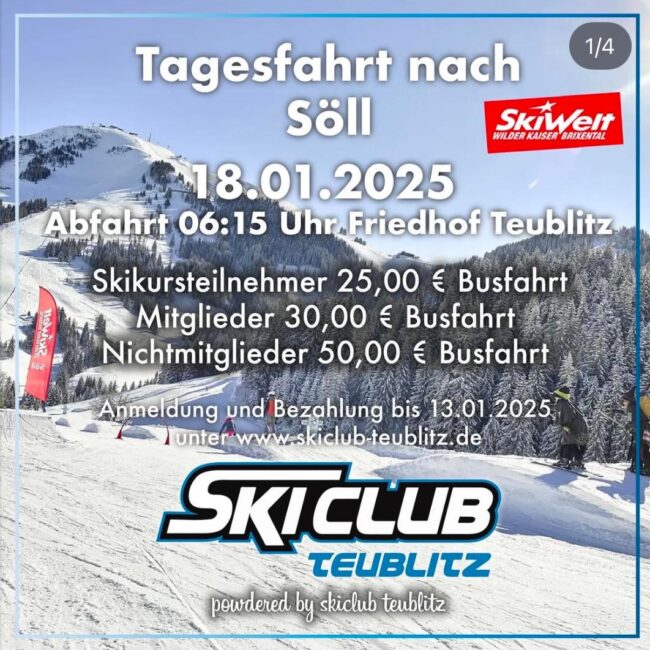 Für die kommende Skisaision 2024 / 2025 haben wir für euch neben dem Highlight der Ski- und Snowboardkurse auch wieder zwei Tagesfahrten nach Söll und ins Zillertal, eine Flutlichtfahrt zusammen mit den sechs Skiclubs des "Städtevierecks" sowie unser Familenwochenende in Saalbach im Programm.